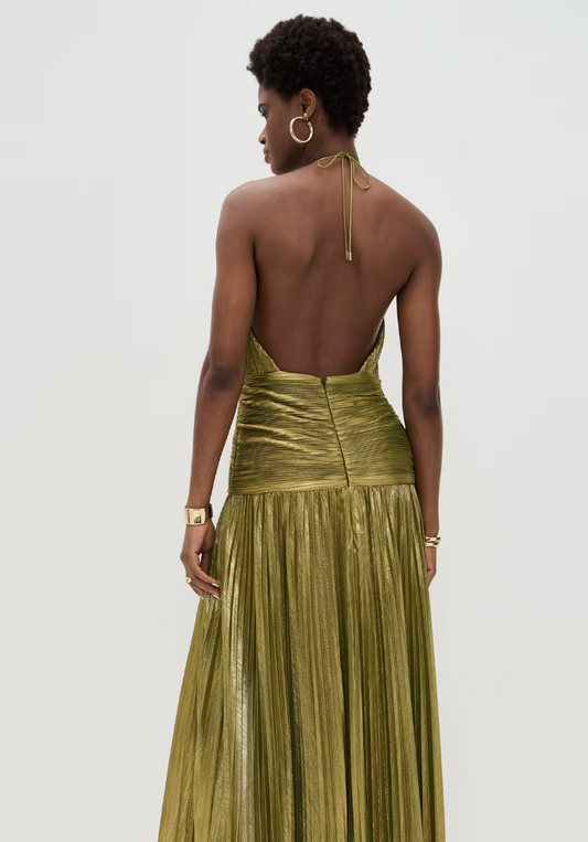 • Pleated Metallic Goddess Maxi Dress